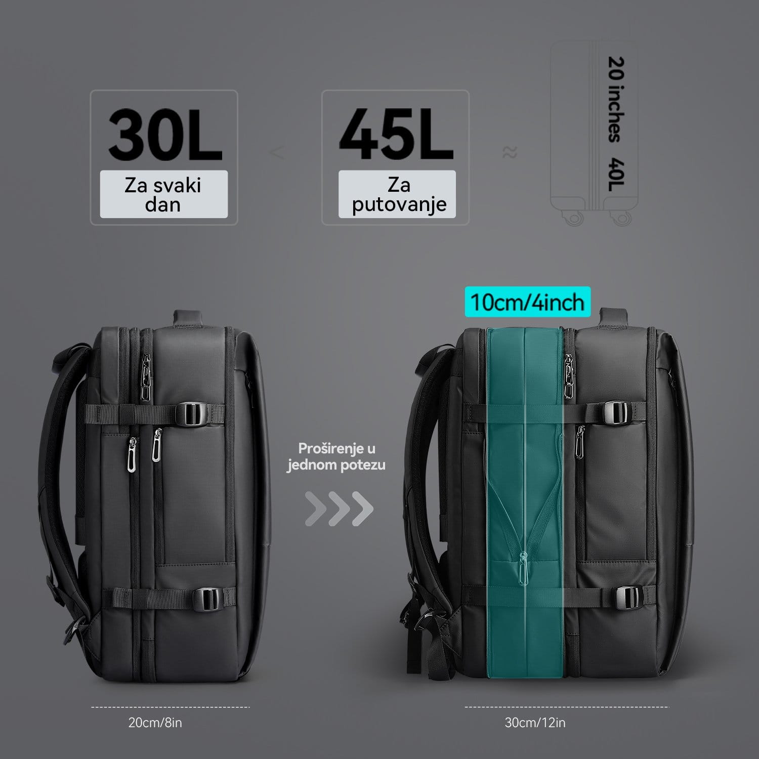 Osnovni kapacitet od 30L savršen je za svakodnevni commuting, dok se pomoću proširenja pretvara u prostrani 45L ruksak – idealan za kraća i duža putovanja.