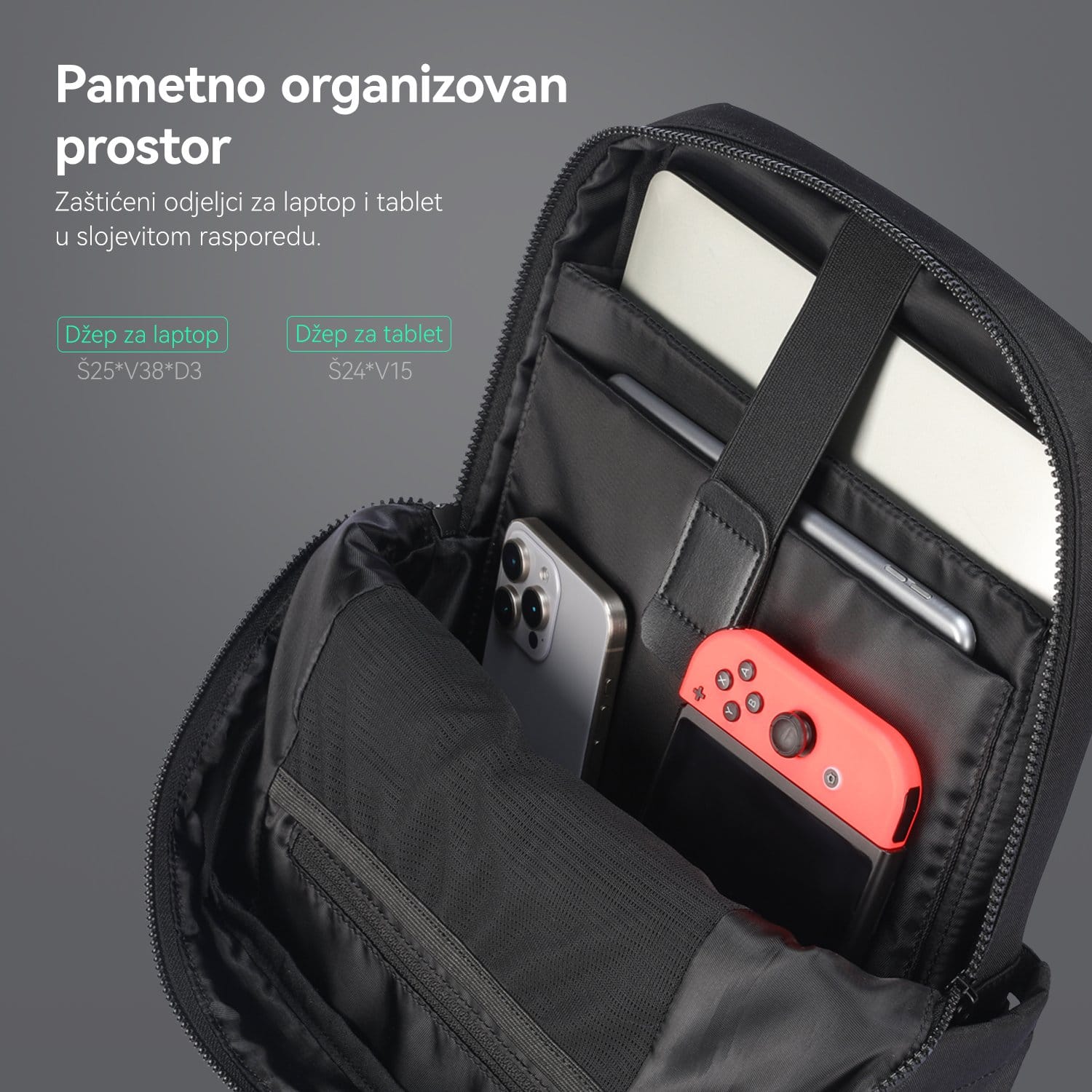 • Prostor za laptop do 15.6” (25 × 38 × 3 cm) i tablet do 24 × 15 cm